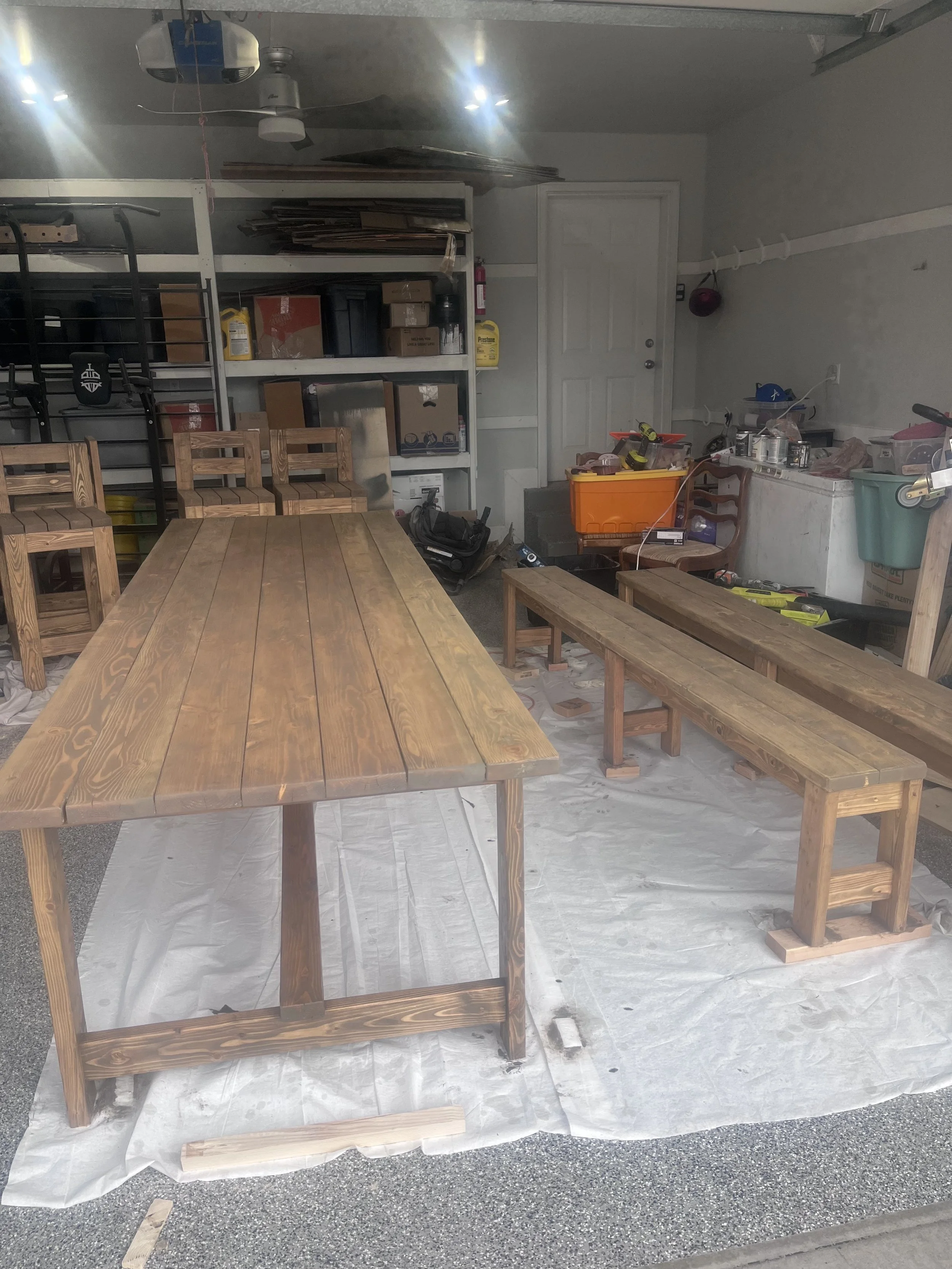 My husband hand-built this charming farmhouse dining set for a client in Salt Lake City who runs an Airbnb nearby. She wanted a beautiful, high-quality set that could comfortably seat up to 12, so he crafted a massive 12-foot table with matching benches — sturdy, built to last, and so giant we had to rent a U‑Haul to deliver it.